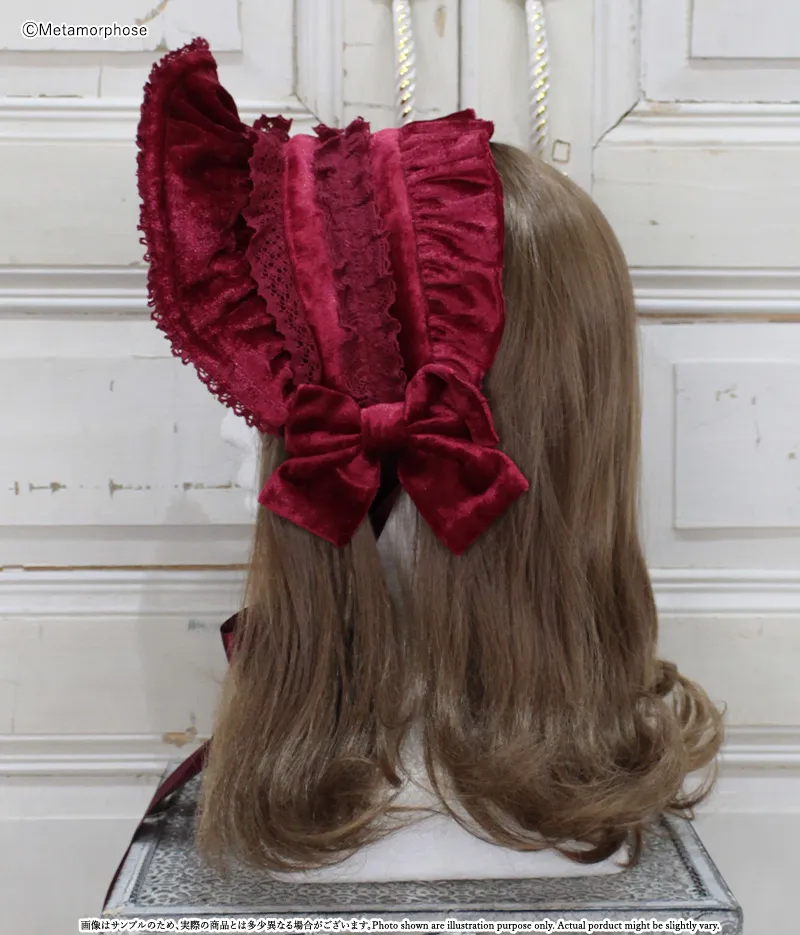 上品な輝きのクラッシュベロアで仕立てたドレスとハーフボンネットのセットです。