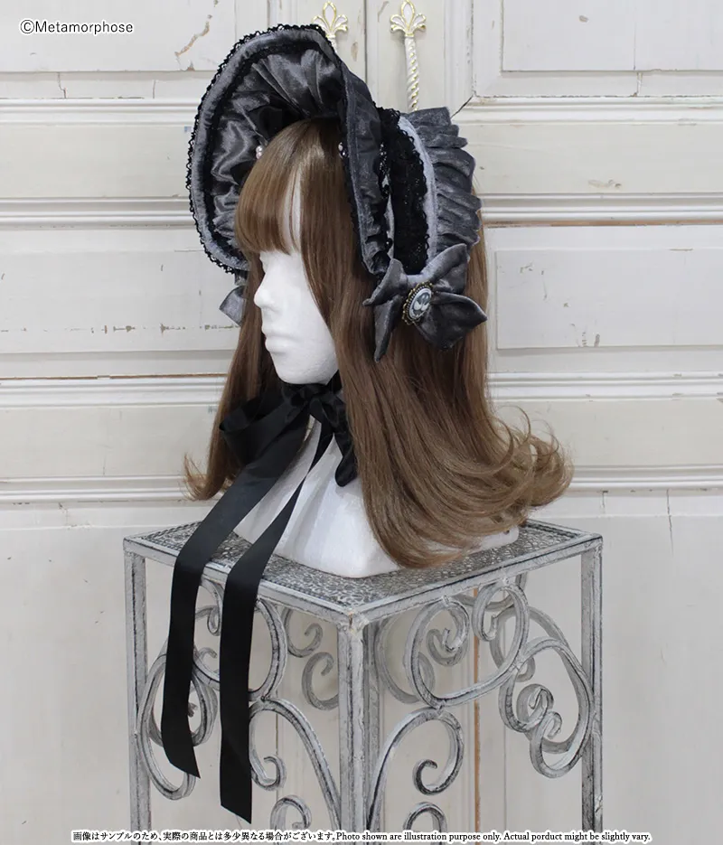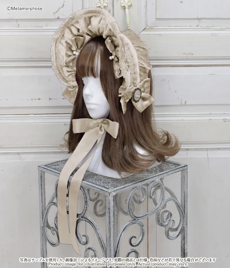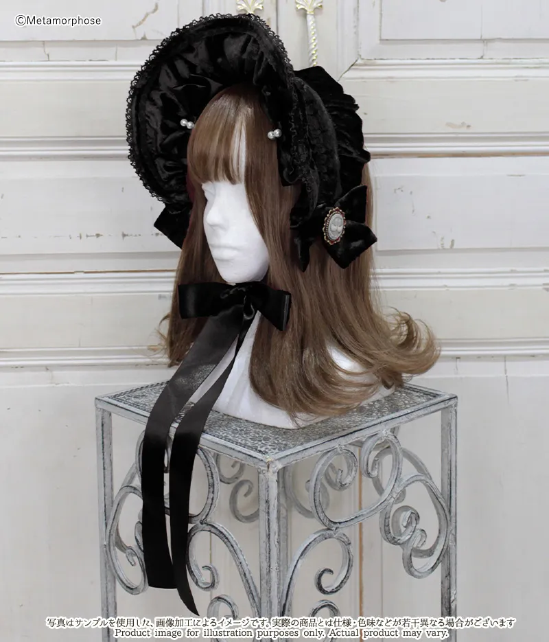 大カメオブローチ(ドレス胸元)、後ウエストリボン、ハーフボンネットリボンブローチ、ハーフボンネット(両サイド小カメオブローチ)